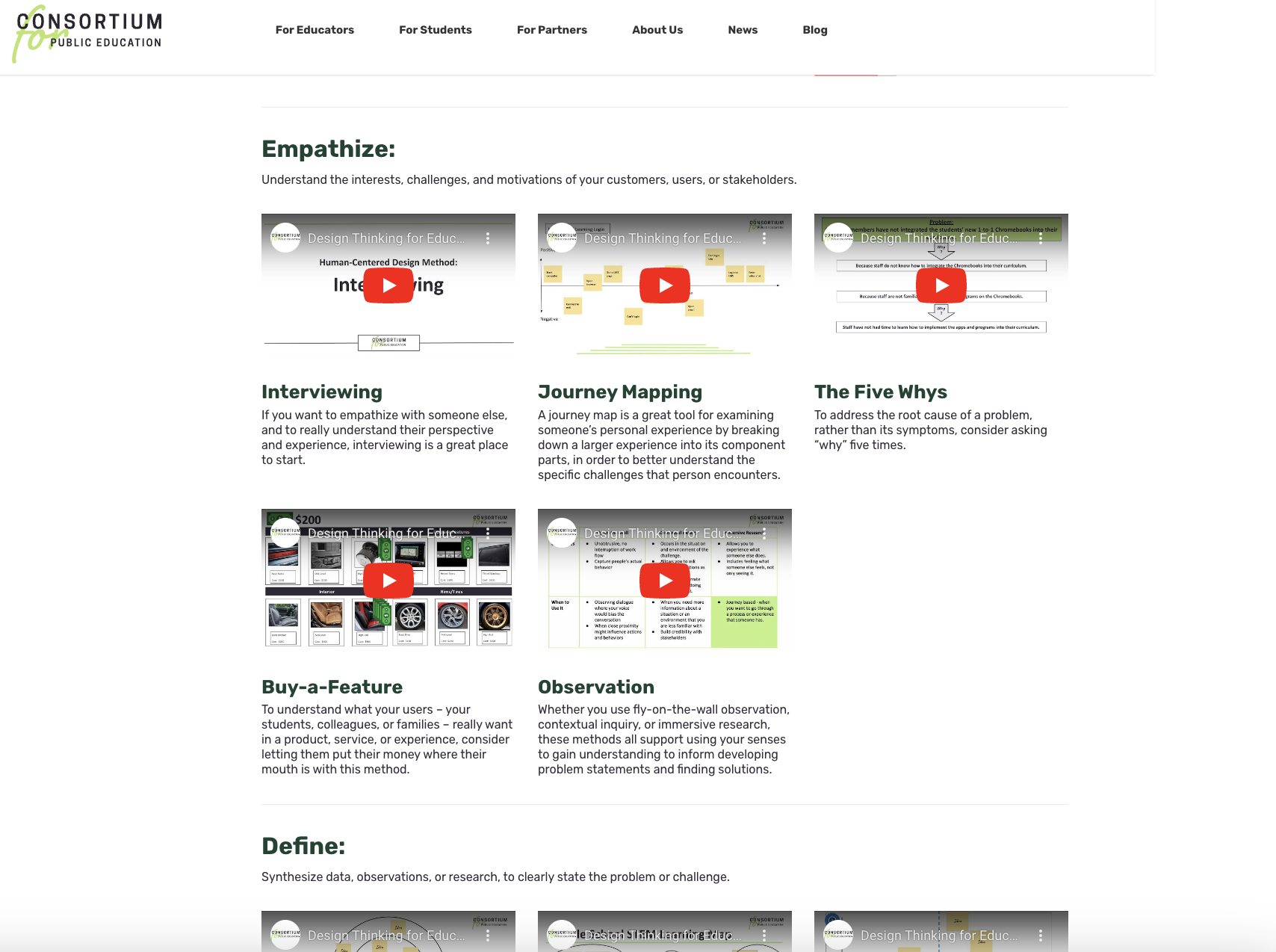 Explore our series of Design Thinking for Education Explainer Videos for a walk-through of a variety of strategies to use with students or adults. The methods support a wide variety of efforts to personalize learning, cultivate competencies in many Portraits of a Graduate, and encourage collaborative problem solving that focuses on serving people.